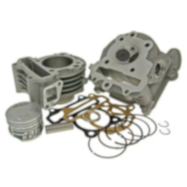 Många av förbättringarna har även gjorts på kolven som nu har två nya CNC-frästa spår som ger nödvändig smörjning till cylinderloppet och verkningsgraden har förbättrats i detta avseende. Speciellt för den känsliga inkörningsfasen av cylindern så har kolven blivit behandlad med ett extra överdrag. Från botten har två oljekanaler införts. Genom att kolven är CNC-bearbetad har förbränningsrummet och kompressionen blivit optimerad. Kitet innehåller också ett topplock med förstorade ventiler och optimerade insugs-/avgaskanaler. Utgående ventilsätets ytterdiameter är cirka 28mm Ingående ventilsätets ytterdiameter är cirka 23,5mm Detta cylinderkit är det mest kraftfulla på marknaden idag. Om du använder originalförgasaren bör den bestyckas. Dock rekommenderas för bästa möjliga effekt en större förgasare, sport-/eller racingvariator samt ett sportavgassystem. Cylindern levereras komplett enligt bild.