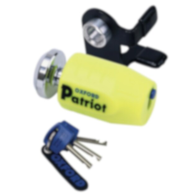 Bromsskivelås Oxford Patriot SSF. 14 mm Godkänt bromsskivelås med hållare. Klass 3 godkänt. OF40. Patriot. Gul. OBS! Kort PIN.