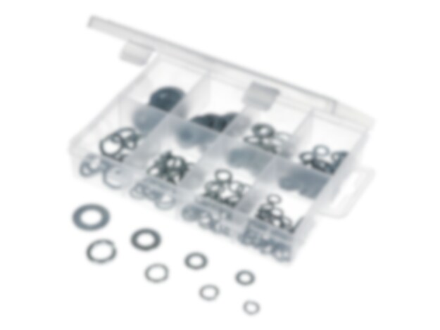 Sortiment med 210 st brickor och fjäderbrickor i olika storlekar från M5 - M10. Galvaniserat för att skydda mot korrosion. Facklåda ingår. Leveransomfång som visas på produktbilden.