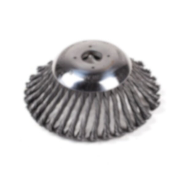 Cirkulärborste med flätade stålborstar för röjning av sly och ogräs. Monteras som en röjsågsklinga. Konformad.