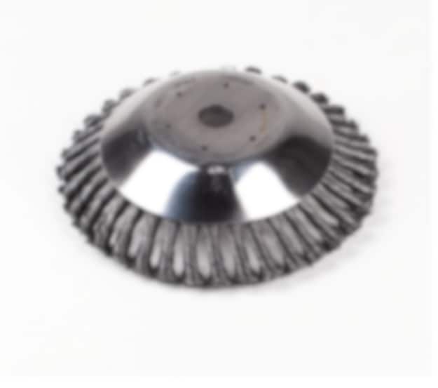 Cirkulärborste med flätade stålborstar för röjning av sly och ogräs. Monteras som en röjsågsklinga. Konformad.