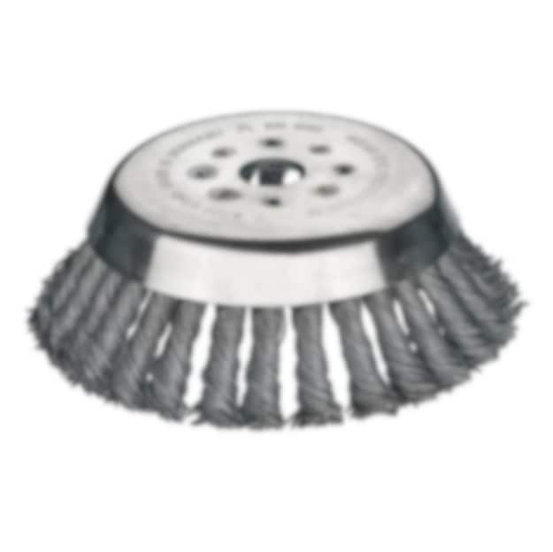 Cirkulärborste med flätade stålborstar för röjning av sly och ogräs. Monteras som en röjsågsklinga. Konformad.