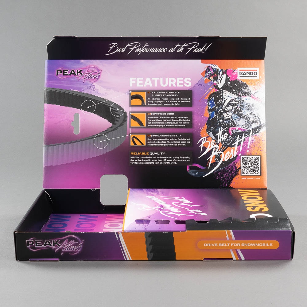 Bando Peak Attack Snow Plus är en modern variatorrem för snöskoter med fokus på pålitligt grepp, kontrollerat varvtal och bra hållbarhet i kyla och belastning. Bando beskriver remmens materialval som framtaget ur deras OE-utveckling, och den är byggd för krävande CVT-drift.