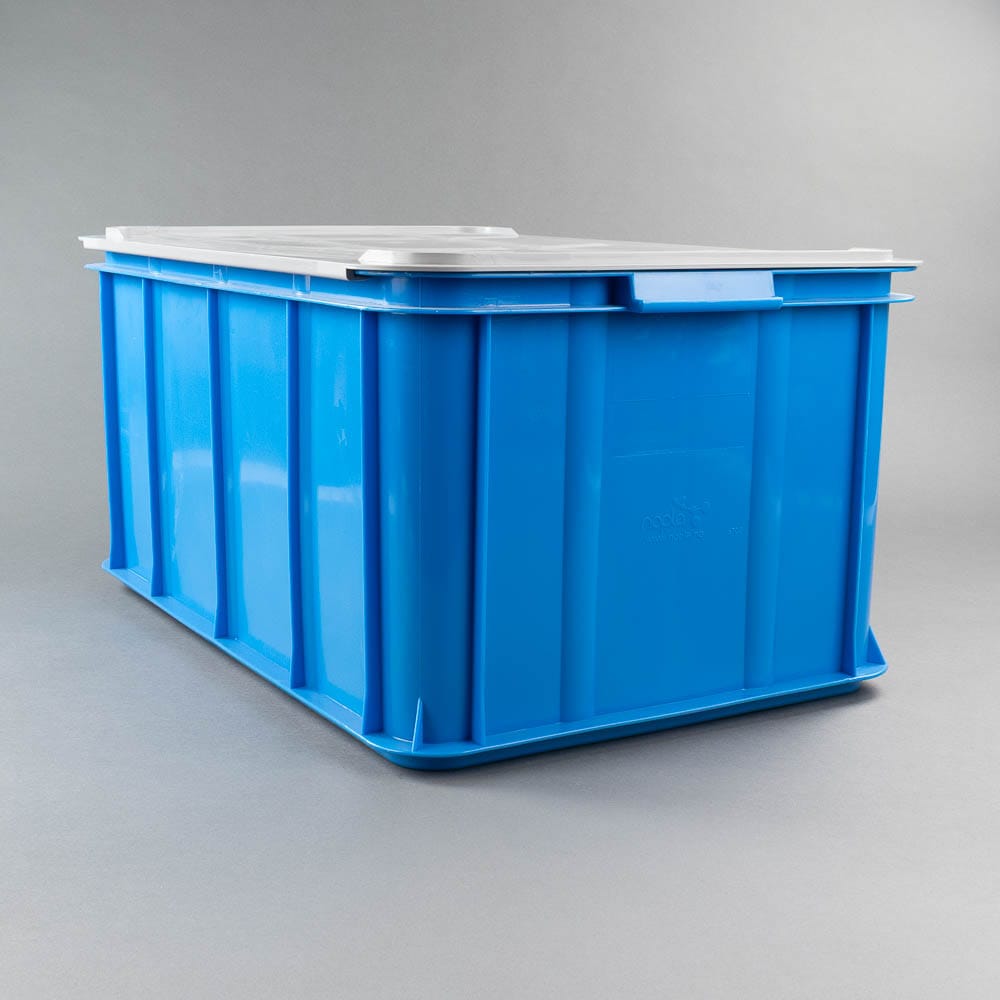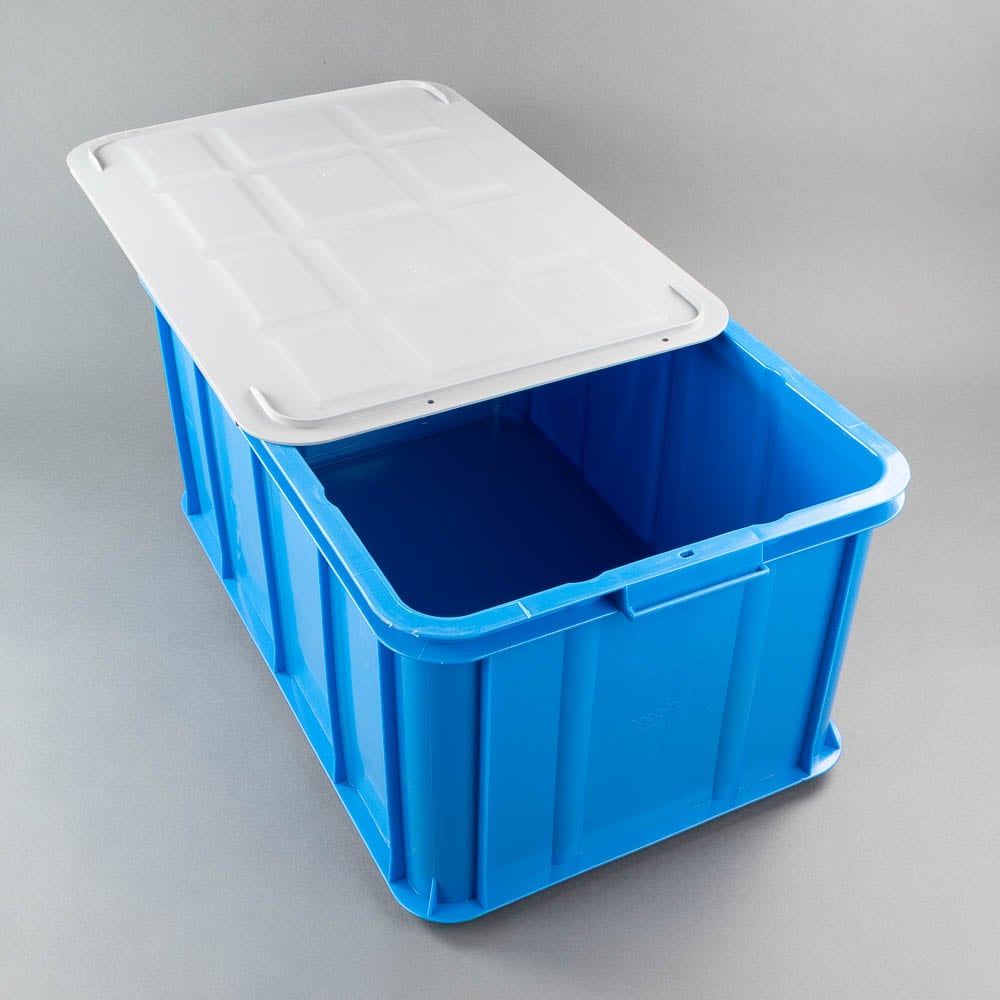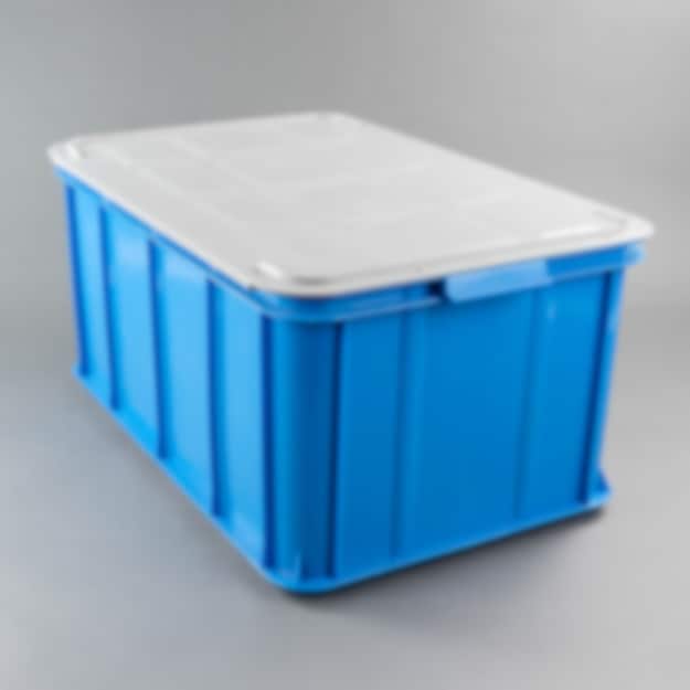 Blå plastlåda med lock till vår packkälke